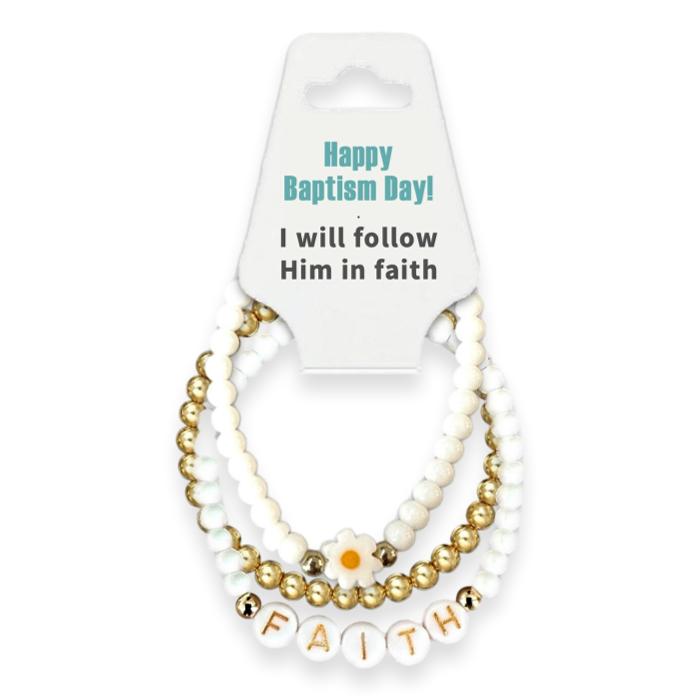 LDS Baptism Beaded Bracelet Gift Set for Girl, 3 Piece Faith Daisy Bead Stacking Bracelets