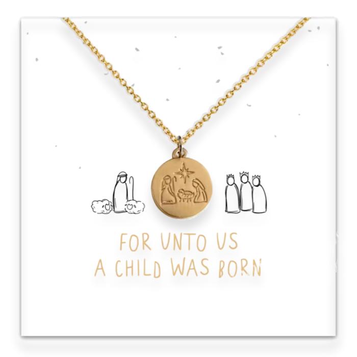 Mary Joseph Baby Jesus Nativity Christmas Necklace, A Child is Born Manger Scene Card
