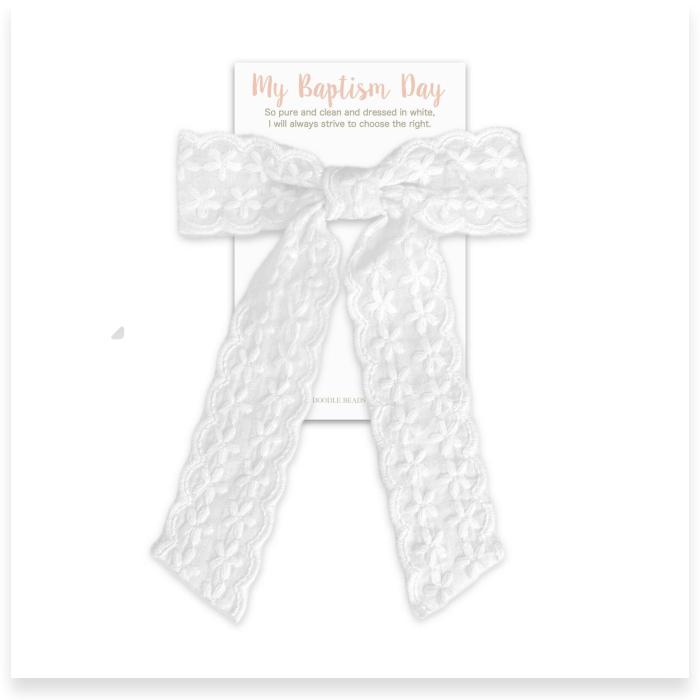 My Baptism Day, White Floral Lace Embroidery Ribbon Long Tail Bow
